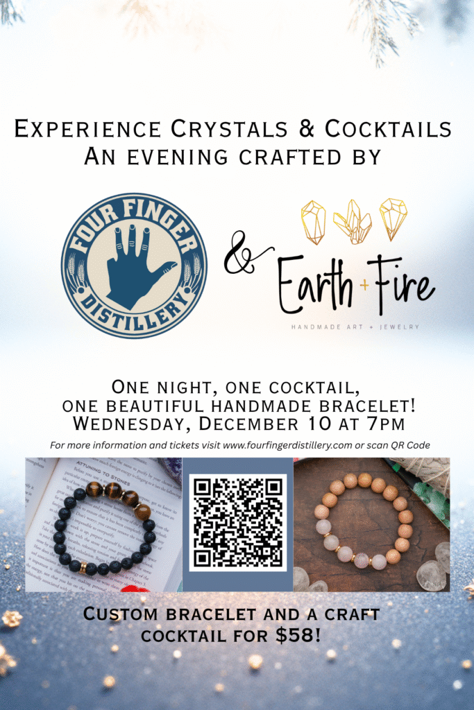 We’ve been working on some pretty awesome things this holiday season, and I’m really excited to finally share one of them with you. We are officially hosting our very first jewelry class—and it’s happening in partnership with an amazing local distillery, Four Finger Distillery. They have three locations here in Indy, and our class will be held at their downtown Indianapolis spot in Fountain Square.